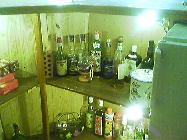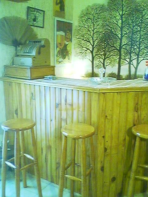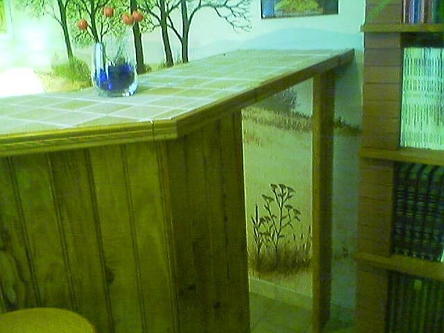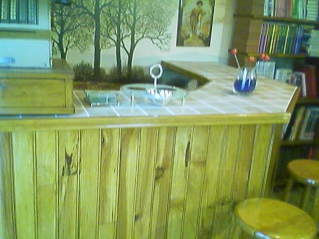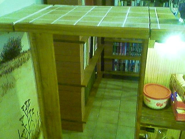 Derrière le bar, contre le mur, j'ai fait une petite étagère avec des planches de pins lasurées de la même couleur. Pour les montants, j'ai utilisé des briques servant habituellement à faire des murettes.